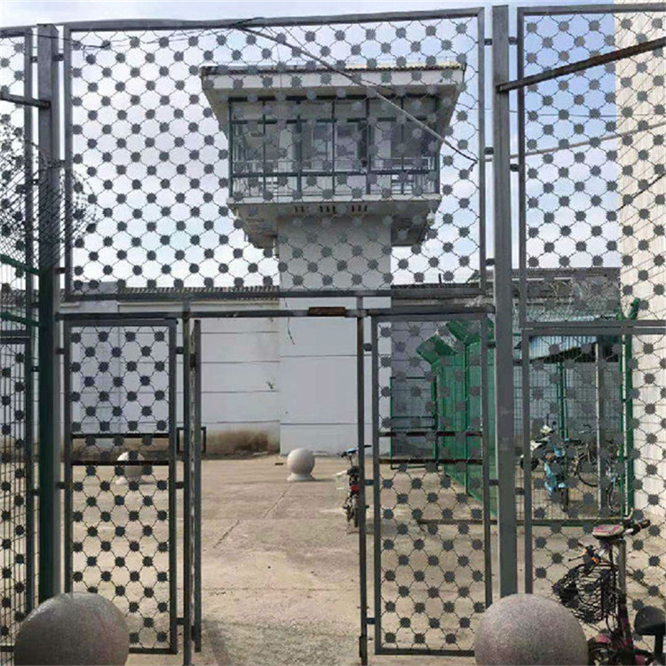 監(jiān)獄隔離網大門,刀片刺網大門,梅花刺網大門是非常重要的監(jiān)區(qū)安全防護設施,是由焊接鋼網加蛇腹形刀刺網組合而成。產品具有結構新穎、堅固緊密、網面平整、網孔均勻、刀鋒銳利、防攀爬、耐腐蝕性強等特點。Y型架上邊架蛇腹型刀刺:由熱鍍鋅鋼板或不銹鋼薄板沖壓出尖利的刀片狀,高張力鍍鋅鋼絲或者不銹鋼絲做芯線組合而成的阻盡器材。刀刺直徑采取50或60厘米,刀型整潔、刀片鋒利排列均勻致密、連接堅固、防腐才能強,可能達到防擎越、防拆卸更高保險等級。