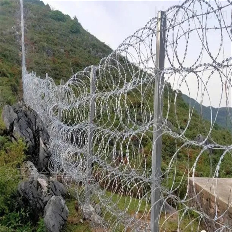 工程案例邊防警戒線圍欄網(wǎng),防攀爬隔離網(wǎng),監(jiān)獄刀片刺網(wǎng)隔離網(wǎng),梅花刺隔離網(wǎng)主要用于監(jiān)獄、看守所、戒毒所、哨所、邊防等的圈禁防護(hù)。梅花刺隔離網(wǎng)由美格網(wǎng)和梅花刺片(因其外形類似梅花得名)組合而成的阻絕器材。由于梅花刺隔離網(wǎng)造形獨特不易觸摸,因而能達(dá)到很好的防護(hù)隔離效果。既美觀又讓人不寒而粟。起到了很好的阻嚇作用。