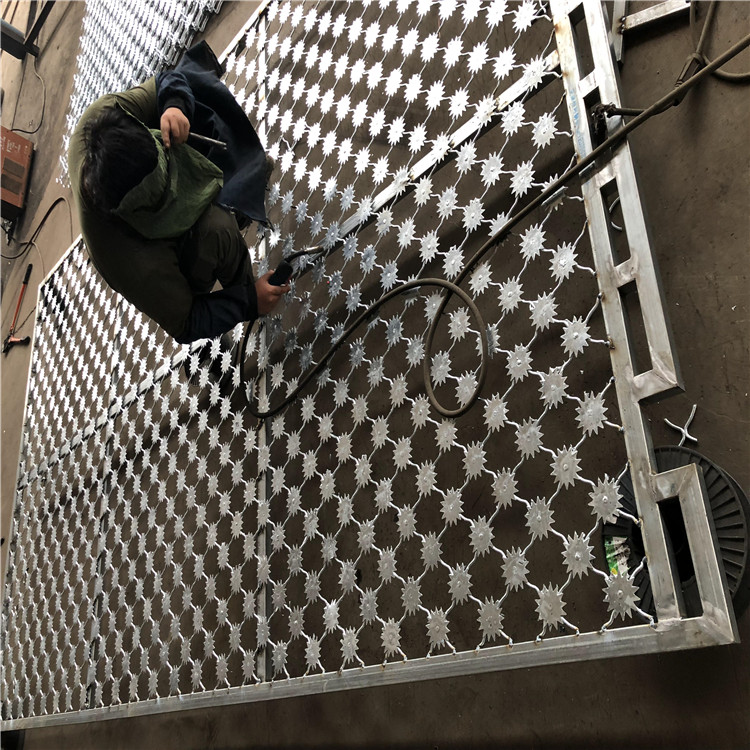 監(jiān)獄梅花刺片隔離網(wǎng)的焊接工藝:將梅花刺片焊接在美格網(wǎng)每一個交接點處,是由二氧化碳保護焊進行焊接的,網(wǎng)邊框為20×30mm、40x60mm、鍍鋅方管,壁厚不得少于1.5mm.然后把焊接打磨好的邊框與網(wǎng)片連接,再經(jīng)過靜電噴涂就算成品了。