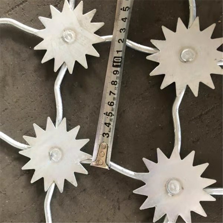 1、監(jiān)獄梅花刺阻隔網(wǎng)銜接、緊固件應選用防盜專用螺栓(螺母)加繃簧墊,裝置固定后無專用工具無法拆開,裝置配件均選用熱鍍鋅處理。