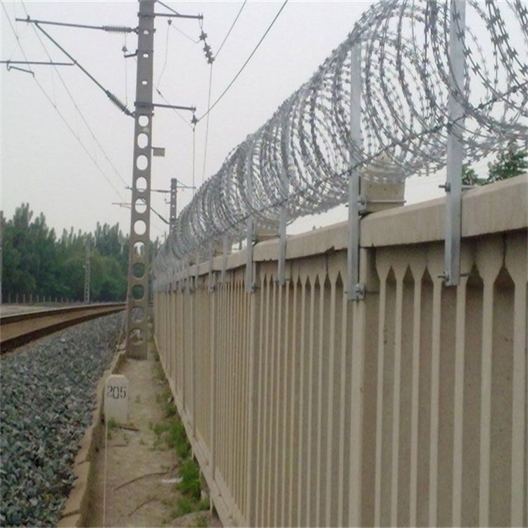 新聞動態(tài)鐵路防護柵欄是為了保障鐵路安全而設(shè)置的一種防護設(shè)施。它的主要作用是防止人員和動物誤入鐵路,避免發(fā)生意外事故。鐵路兩側(cè)上安裝刺絲滾籠不僅能保護列車行車安全,而且還起到保護沿線群眾人身安全的作用。鐵路防護柵欄如何配合刺絲滾籠使用?鐵路刺絲滾籠主要包括刀片剌網(wǎng),刺繩,和支架及卡扣等。配合立柱支架、加密支架、臺階支架安裝在水泥立柱上起到固定的作用,立柱一般間隔3米安裝一個,中間加裝一個加密支架。