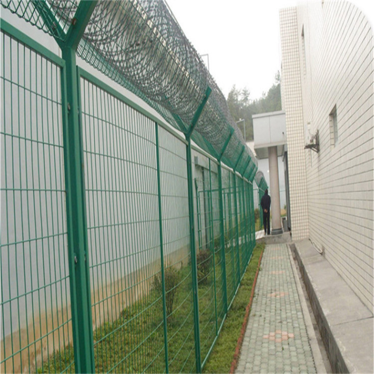 看守所隔離網立柱的規(guī)格采用優(yōu)質國標鋼管制作,常用規(guī)格為60mm*60mm、60mm*80mm、80mm*80mm、100mm*100mm方管或者直徑為Φ60mm、Φ75mm、Φ88mm、Φ114mm圓管。通常采用Y字型立柱,這種造型是為了方便在頂部架設刀片刺網,刀片刺網的刀片非常鋒利,即使犯罪分子爬到護欄網上邊也是無法翻越的,只要觸摸到就會被刺傷,這種組合模式可以大大提高監(jiān)獄隔離網的安全防護性能。