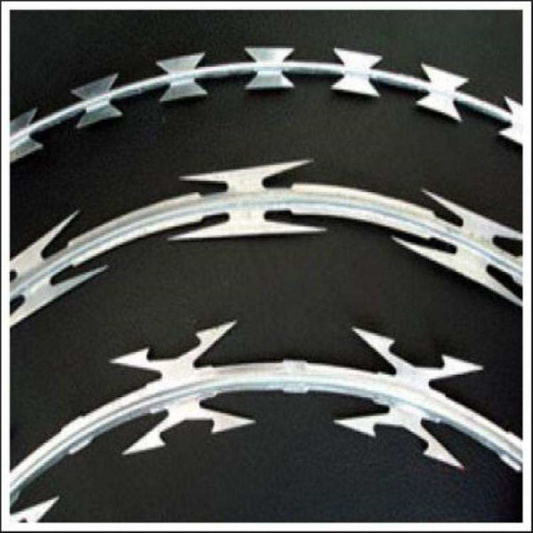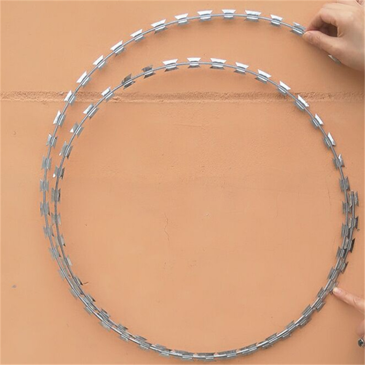 螺旋型交叉式刀片刺網(wǎng)系在兩條刀片刺網(wǎng)之間以不銹鋼片和鍍鋅鋼片強(qiáng)力夾和,展開(kāi)后即成交叉狀,取其美觀又實(shí)用。