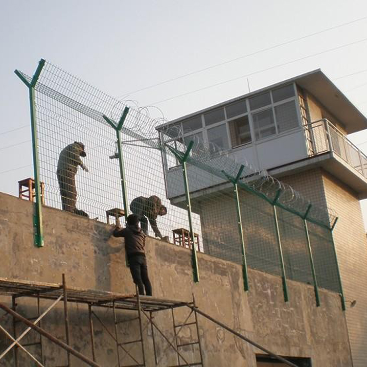 監(jiān)獄圍墻加高隔離網(wǎng)是監(jiān)獄中經(jīng)常使用的圍欄,監(jiān)獄護(hù)欄網(wǎng)是一種新型的安全圍欄,又稱“Y型安全隔離網(wǎng)”通常在圍欄上方裝有刺籠刀片,并用鐵絲網(wǎng)固定能有效的防攀爬和人為破壞,防止囚犯逃逸、巡視檢查方便。被廣泛應(yīng)用在監(jiān)獄,軍事基地等高安全場所。在監(jiān)獄護(hù)欄網(wǎng)頂部安裝刀片刺籠有很好的增加了安全防護(hù)性能??梢云降匕惭b,也可以在圍墻上二次安裝。和機(jī)場護(hù)欄網(wǎng)相似,由V形支柱、焊接網(wǎng)和緊固件組成,不易變形。