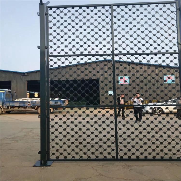6、監(jiān)獄梅花刺阻隔網(wǎng)間隔(一般為75米)應(yīng)將網(wǎng)墻立柱做一次雙柱分段阻隔,雙柱空隙不大于10mm。網(wǎng)墻角落和分段處的兩根立柱應(yīng)預(yù)制連體底座,連體底座的體積應(yīng)為單體底座的兩倍。