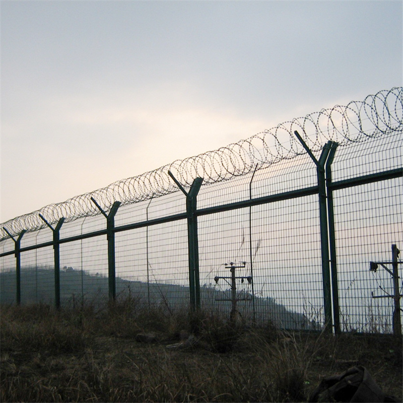編織網(wǎng)機(jī)場(chǎng)圍界 | 2.5m | 10m,15m, 30m | 3-5mm | 50x50mm, 60x60mm | 熱鍍鋅; 粉末噴塑; PVC浸塑 | V型網(wǎng), V型支架,刺絲,刀片刺繩,立柱 |
