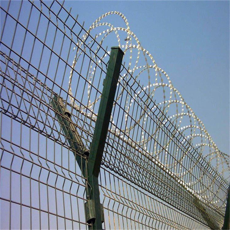 機場圍界和監(jiān)獄隔離網(wǎng)又稱作“Y型安全防御護網(wǎng)”,都是由折彎網(wǎng)片,V型支架立柱,加強型焊接片網(wǎng),上面有刀片刺繩(又稱刀刺網(wǎng),刀片護網(wǎng))安全防盜連接件組成強度和安全防御性級別很高。因立柱外形酷似英文字母Y,所以被稱為Y型安全防御護網(wǎng)。頂部加裝刀片刺絲、刀片刺網(wǎng)后又很好的增強了安全防護性能。產(chǎn)品造型美觀、花色多樣,既起到圍欄作用,又起到美化作用。由于具有安全性高、防攀爬能力好,網(wǎng)片連接方式采用特制SBS緊扣件,有效防止人為的破壞性拆卸,橫向2-4道折彎加強筋,使網(wǎng)面強度增加,每6米增加一根斜撐,這樣防風(fēng)性能也加強了。