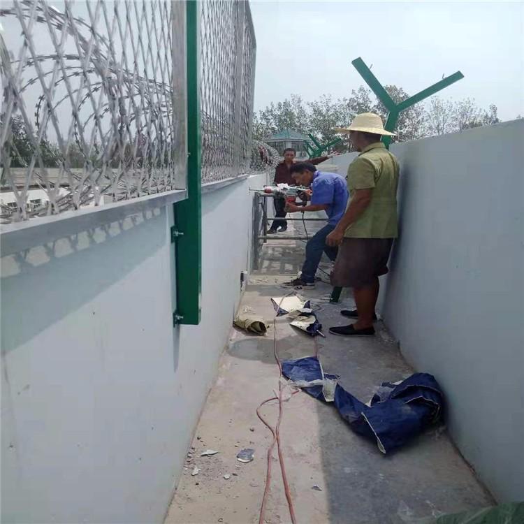 監(jiān)獄圍墻刀片隔離網(wǎng)主要是采用高強度的刀片刺網(wǎng)與普通防護網(wǎng)的結(jié)合,由v型支架立拄,加強型焊接片網(wǎng),安全防盜連接件和刀片刺網(wǎng)組成.刀片刺網(wǎng)是一種新型防護網(wǎng),由銳利尖角鍍鋅鋼板或不銹鋼薄板做刀片,鋼絲做芯線組合而成的防護器材.是由V型支架立柱,加強型焊接片網(wǎng),安全防盜連接件和熱鍍鋅刀片刺籠組成強度和安全防御性級別很高。近年來,被廣泛應(yīng)用在監(jiān)獄,軍事基地等高安全場所。